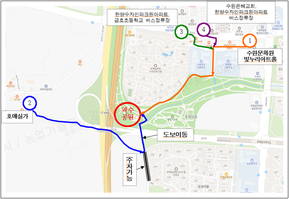 | ➀ 수원문화원 빛누리아트홀(권선구 호매실로 237) 지상 주차장 주차 후 도보 이동(약 10분 소요) ➁ 「호매실가」 카페(칠보로14번길 157)에서 800m 직진 후 호매실 경남아너스빌 15단지 아파트 보이면 길 변 주차 후 도보로 이동(약 3분 소요, 굴다리 지나야 함) ➂ 한양수자인 파크원 아파트, 금호초등학교(버스정류장)에서 도보로 이동(약 10분 소요) ④ 수원은혜교회, 한양수자인 파크원 아파트(버스정류장)에서 도보로 이동(약 10분 소요) |