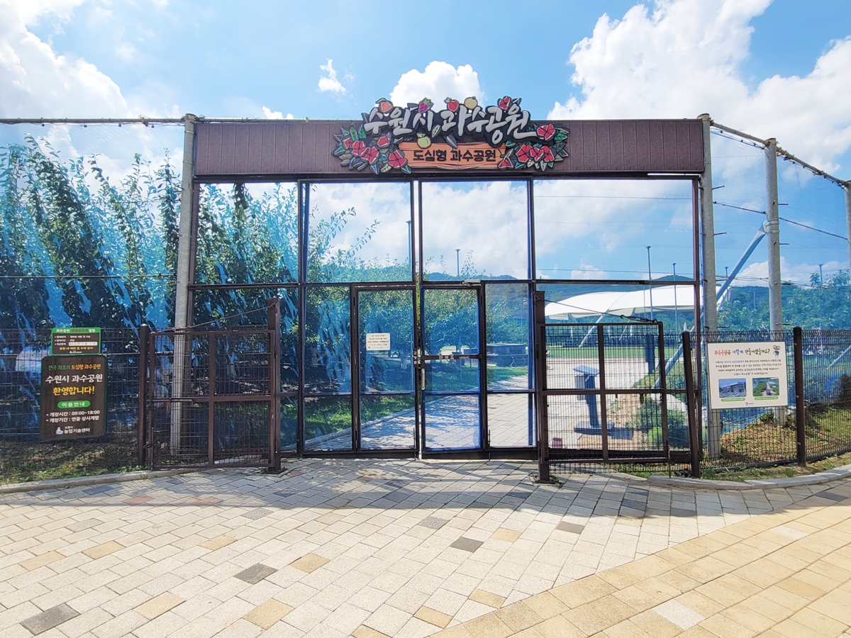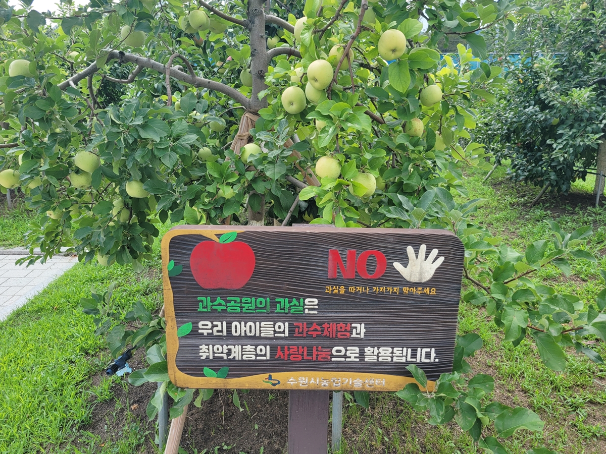수원시 농업기술센터에서 공원을 가꾸고 시민들에게 개방하는 것만으로도 감사한 일이니, 과일은 눈으로만 즐겨주시기를 부탁드립니다. 혹시 모를 상황을 대비해 곳곳에 CCTV가 설치되어 있으며, 직원이 상시 순찰을 돌고 있습니다.