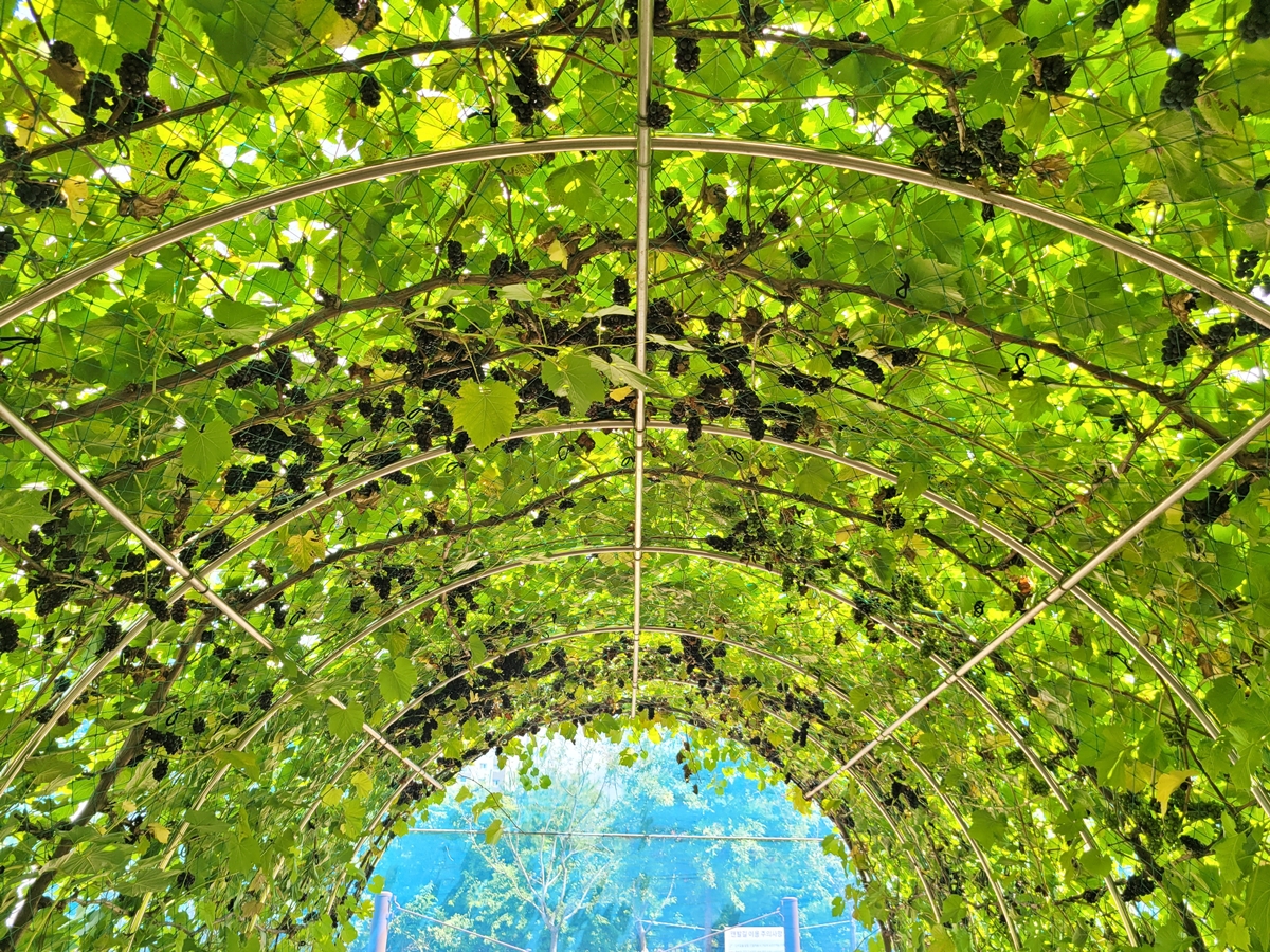 머루 터널에는 야생 포도의 일종인 머루가 주렁주렁 열려 있습니다. 보통 8월에서 10월 사이에 수확하는 머루는 포도와 비슷하게 생겼으며, 달콤새큼한 맛이 납니다. ‘머루랑 다래랑 먹고 청산에 살어리랏다’는 옛 노래 가사에도 나오죠.