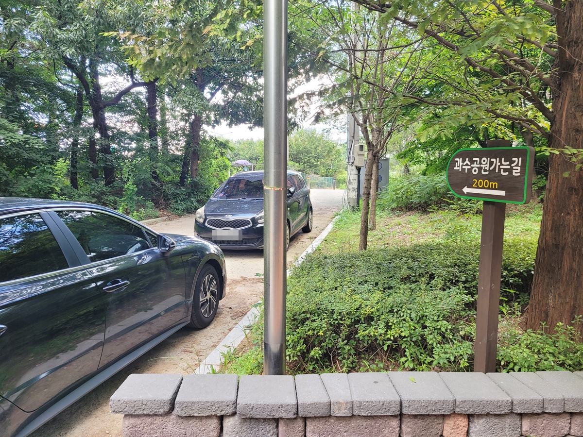 저는 수원농업기술센터에서 알려준 대로 '호매실가' 카페에서 800m 직진 후에 보이는 호매실 경남아너스빌 아파트 인근 길가에 주차하고 쉽게 갔습니다. ②번 방법으로 갈 때는 토끼굴 같은 굴다리를 지나면 바로 과수공원이 나옵니다.