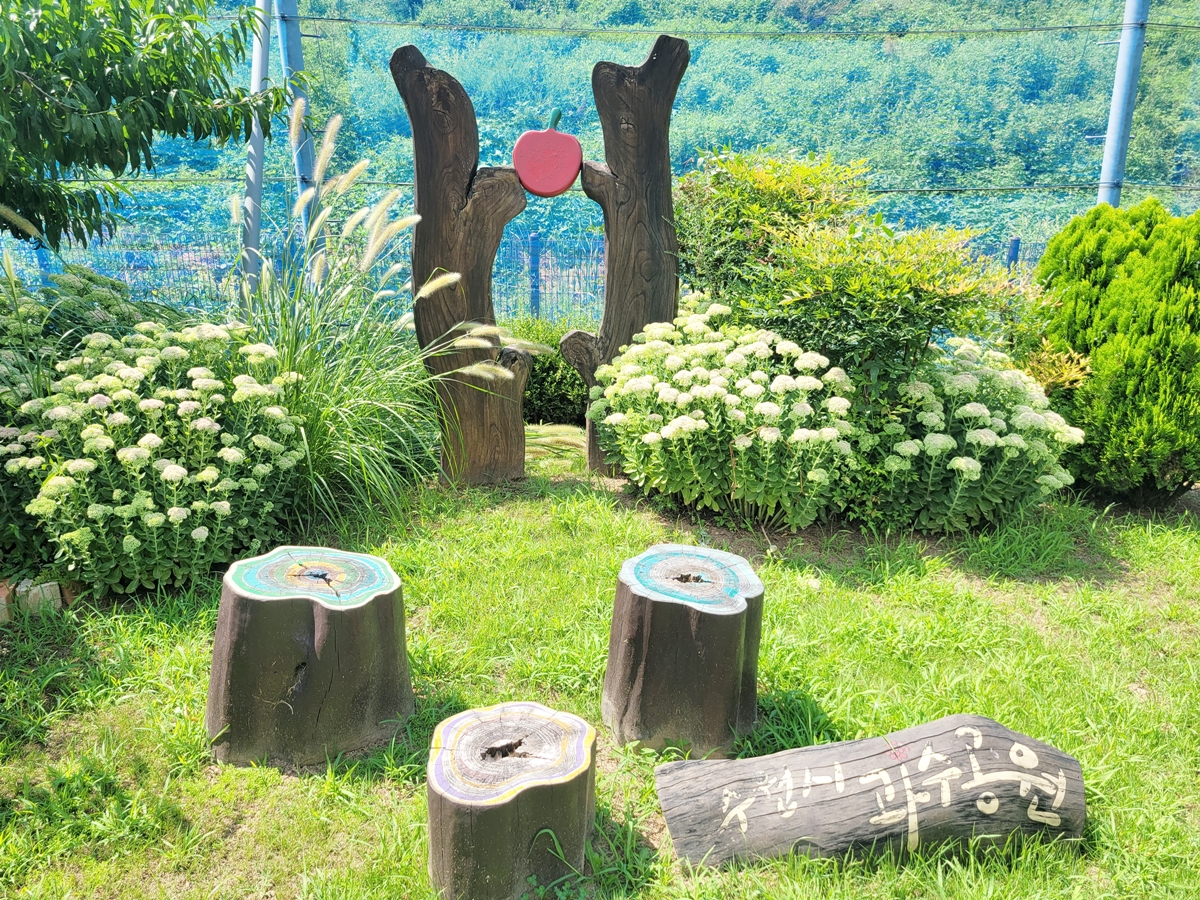 과수공원 곳곳에는 아름다운 추억을 남길 수 있는 포토존과 쉼터가 마련되어 있습니다. 특히 과수공원 가장 안쪽에는 나무로 만든 의자와 '수원시 과수공원' 현판이 있는 포토존이 있어 가족과 함께 인증사진을 남길 수 있습니다.