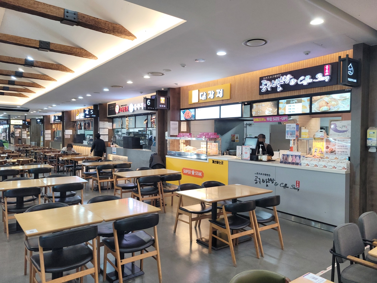 건물 내부로 들어서면 깔끔하게 정돈된 식당가 '맛집거리'가 펼쳐집니다. 푸드코트 형태로 되어 있어 여러 종류의 음식을 한자리에서 맛볼 수 있는 것이 장점입니다. 메뉴판에는 다양한 한식, 양식, 분식 등이 준비되어 있어 가족 단위 여행객들이 만족할 만한 식사를 즐길 수 있습니다.