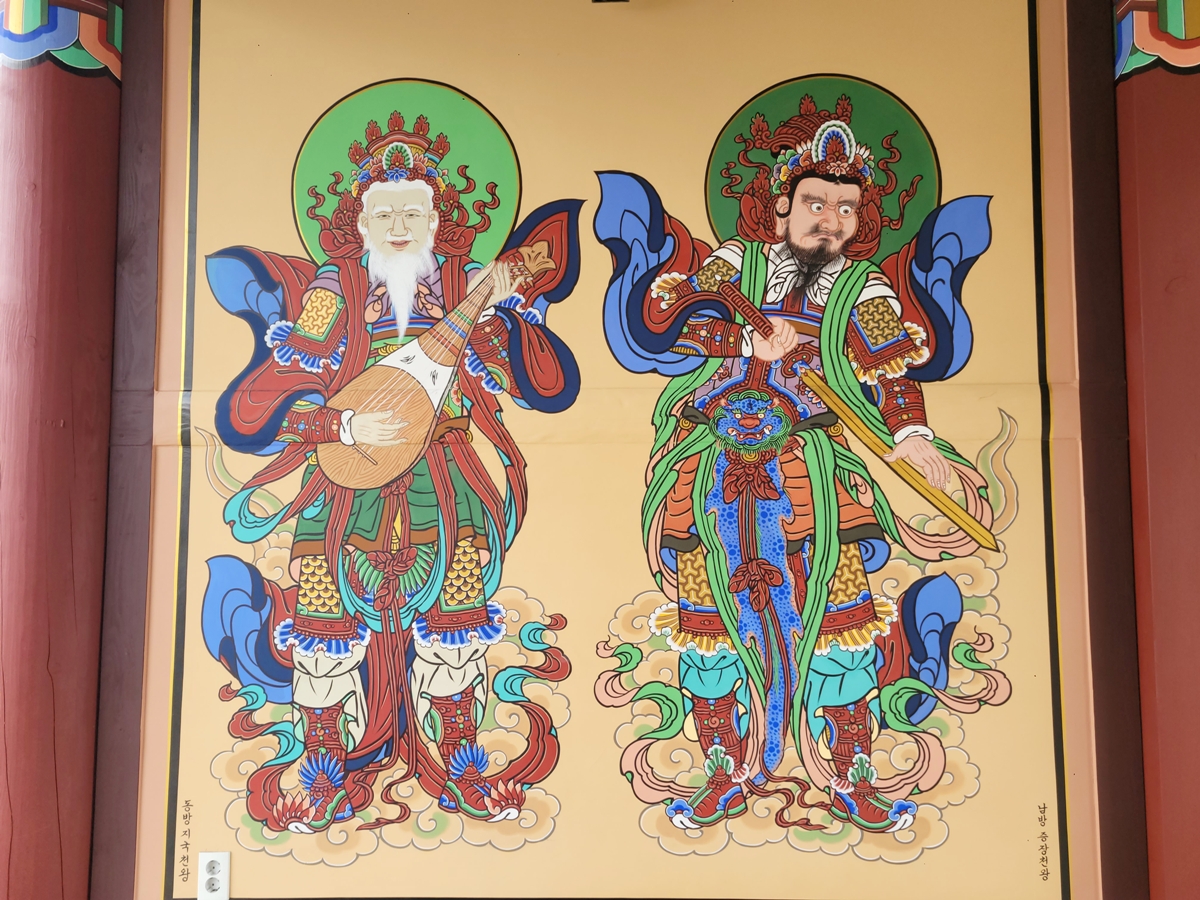 출입문에 실천 보현보살과 지혜 문수보살이 있습니다. 그림 옆에 어떤 보살인지 쓰여 있어 일반인도 알 수 있습니다. 실천 보현보살은 흰 코끼리를 타고 연꽃을 들고 있습니다. 지혜 문수보살은 푸른 사자를 타고 지혜의 칼(또는 여의봉)을 들고 있습니다.