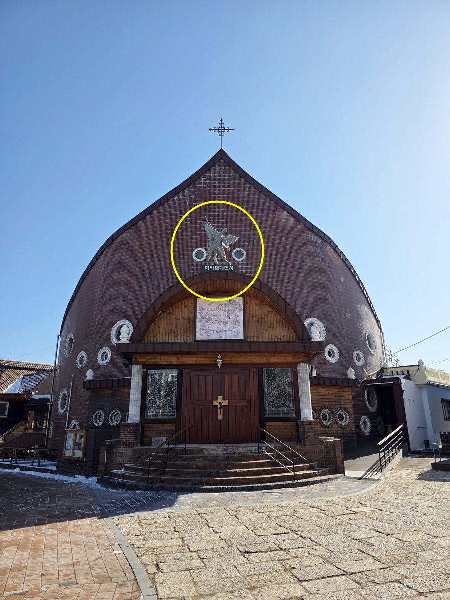 성당 마당에 들어서면 가장 먼저 눈에 띄는 것은 독특한 외관의 대성당입니다. 붉은 벽돌과 둥근 아치형 지붕이 인상적인데, 성당 위를 유심히 보세요. 칼을 들고 악을 물리치는 '미카엘 대천사' 상이 우리를 반겨줍니다. 미카엘 대천사 상 아래에는 조선시대 화성행궁 주변의 고지도가 있습니다.