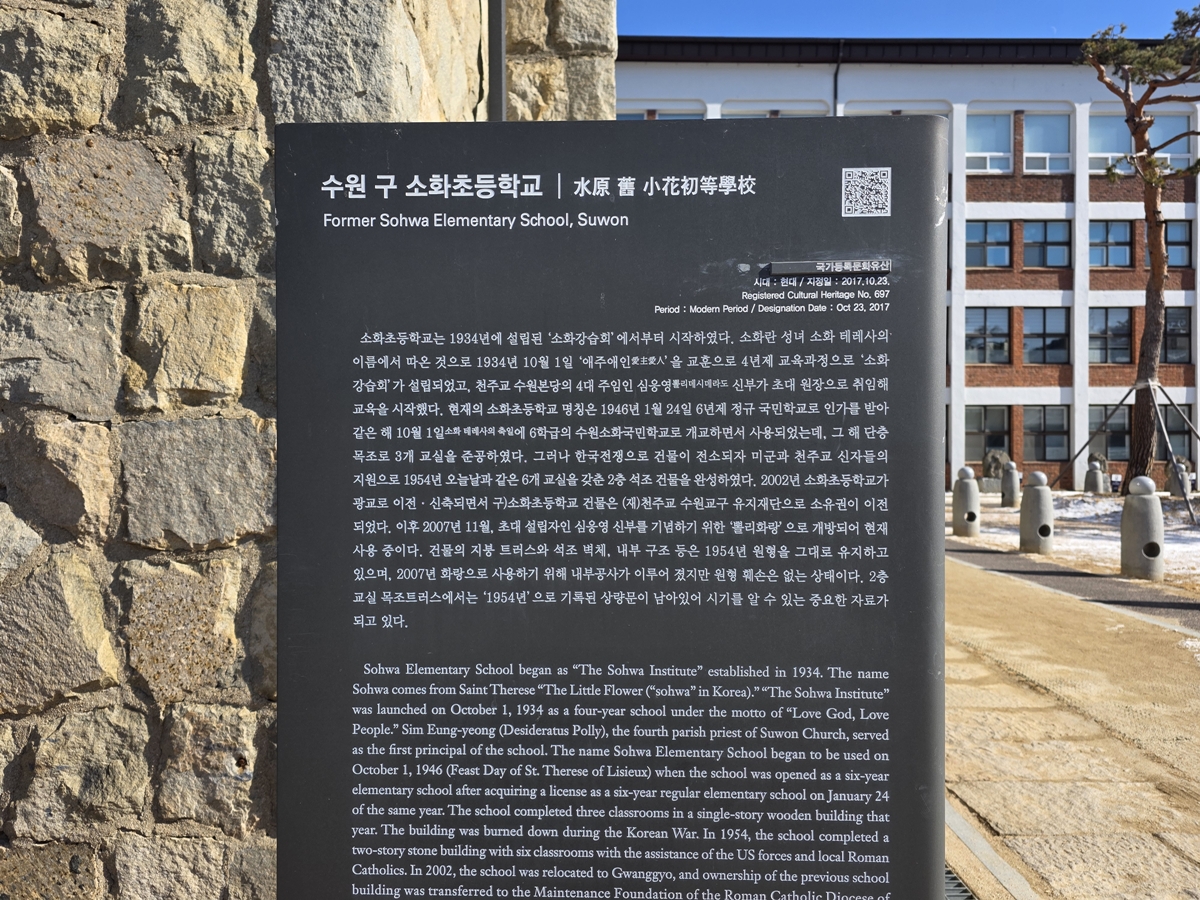 성당 마당 안쪽에 석조 건물이 하나 있습니다. 바로 등록문화재 제697호로 지정된 '수원 구 소화초등학교' 건물입니다. 1954년에 완공된 이 건물은 거친 질감의 석재 외벽이 세월의 멋을 그대로 간직하고 있어 사진 찍기에도 정말 좋은 명소입니다.