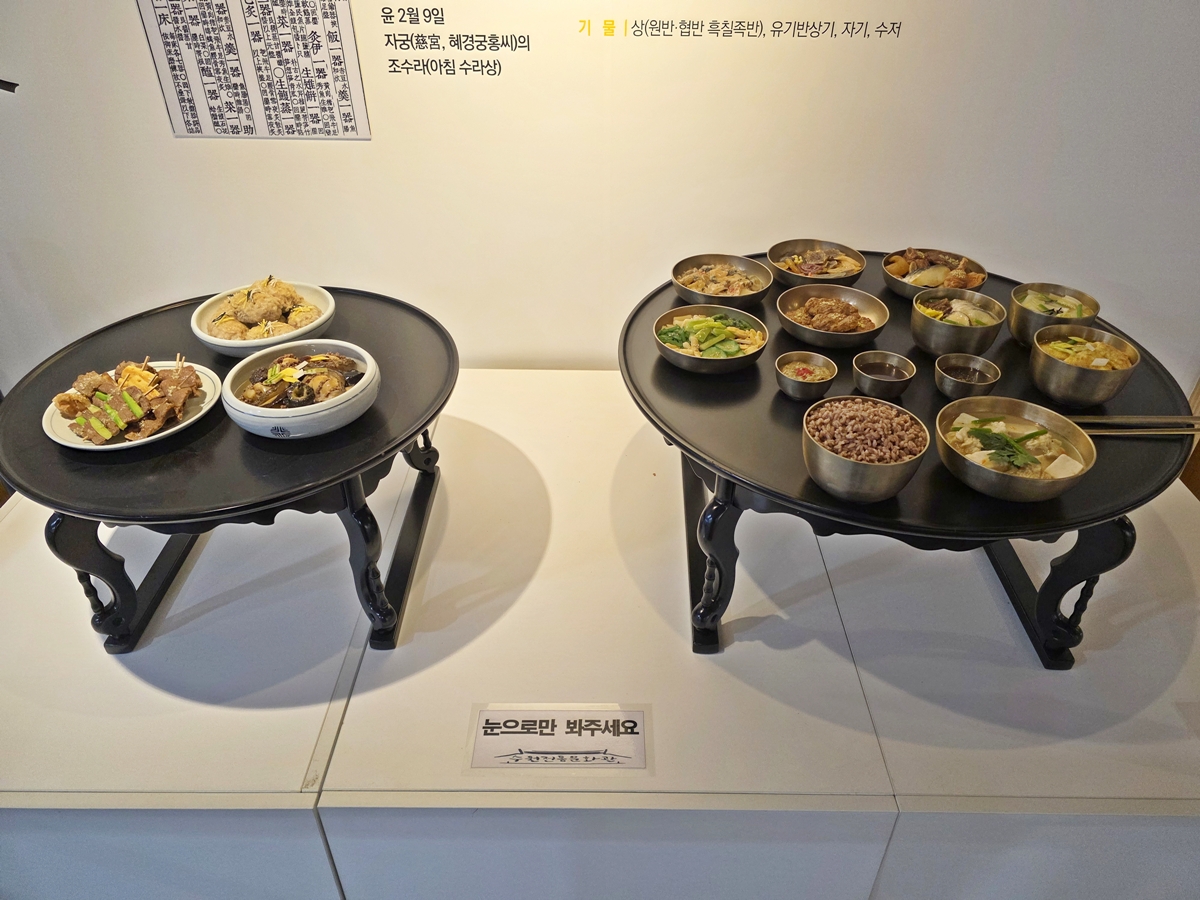 이번 전시에서 가장 궁금했던 것은 혜경궁홍씨가 받았던 ‘아침 수라상’입니다. 흰 쌀밥과 탕을 기본으로 각종 찜, 조림, 구이, 전유화 등 13기(29품)에 달하는 산해진미가 놋그릇과 자기 그릇에 정갈하게 담겨 있습니다. 어머니의 건강을 기원하며 정조가 세심하게 신경 썼을 메뉴 구성에서 왕의 지극한 효심이 그대로 느껴집니다.
