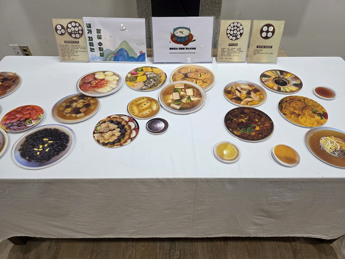 전시실 가장 안쪽에 관람객이 직접 왕실의 상차림을 재현해 볼 수 있는 ‘상차림 체험존’도 마련되어 있습니다. 체험 내용은 '내가 차리는 왕실 수라상'이라는 주제로, 준비된 음식 판을 활용해 비어있는 자리를 직접 채워볼 수 있습니다.