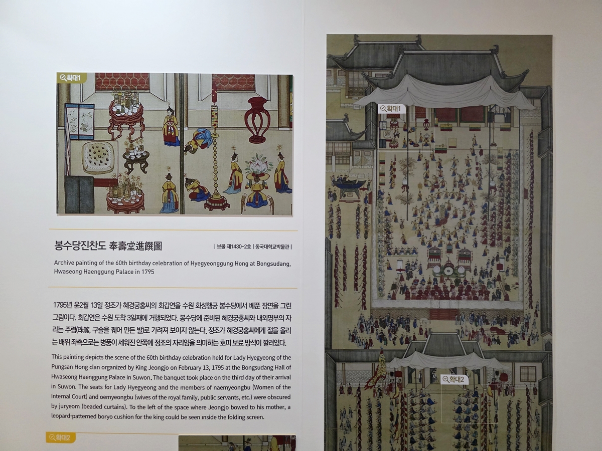 전시의 하이라이트는 단연 ‘진찬연’에 대한 기록입니다. 여기서 ‘진찬연’이란 왕실에 경사가 있을 때 올리는 잔치를 말합니다. 정조는 화성행궁의 봉수당에서 어머니를 위한 회갑 잔치를 이례적으로 성대하게 거행했습니다. 2년이라는 긴 준비 기간을 거쳐 체계적으로 기획된 이 잔치는 조선 시대를 통틀어 가장 화려하고 감동적인 회갑연 중 하나로 손꼽힙니다.