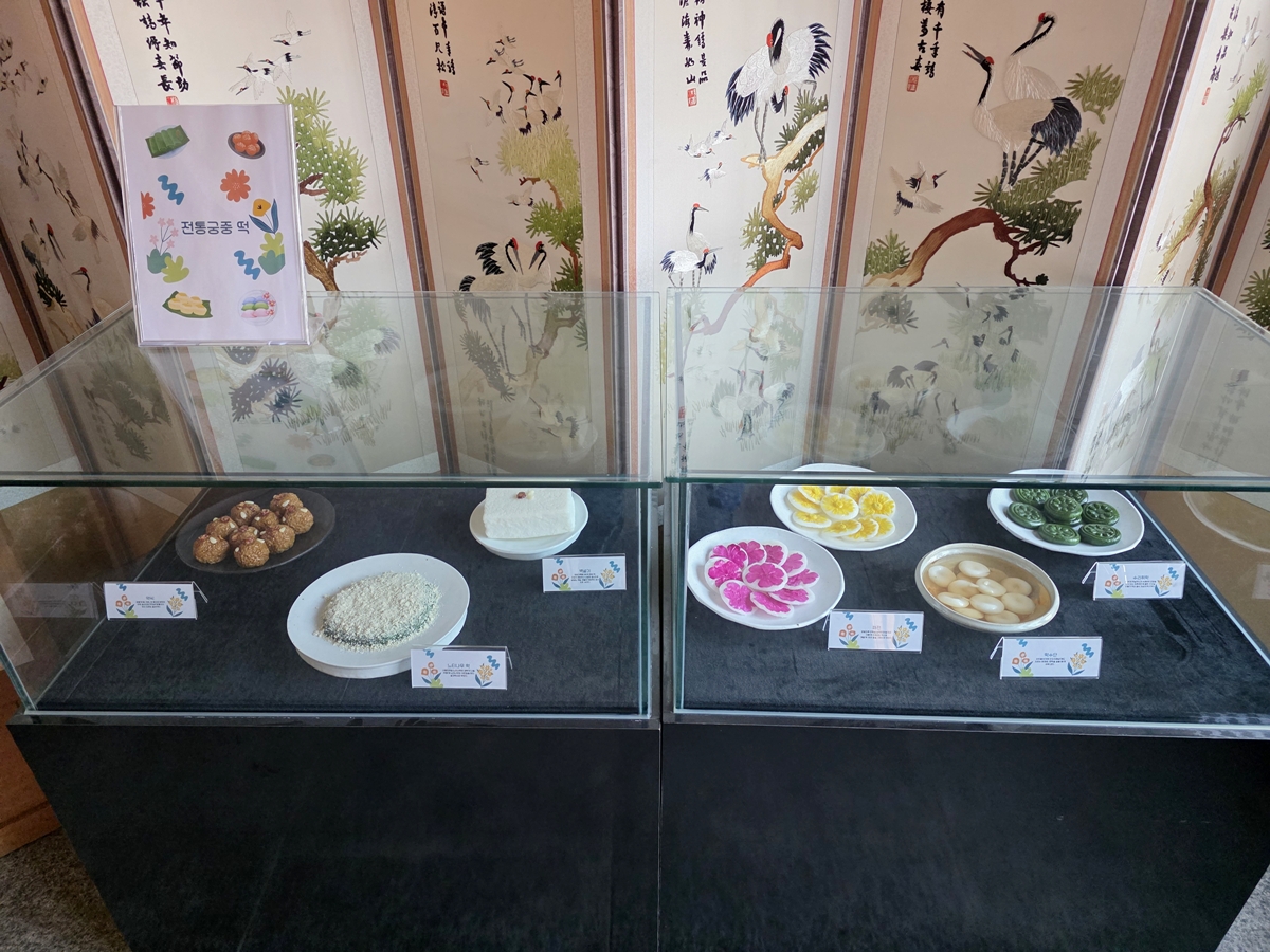 전시실에 들어서면 가장 먼저 눈길을 사로잡는 것은 화려한 색감의 ‘전통 궁중 떡’입니다. 잔치 음식에서 빠질 수 없는 떡은 그 종류와 모양이 매우 다양합니다. 먹기 아까울 정도로 예쁘게 만들어서 입보다 눈이 먼저 호강하는 음식입니다.